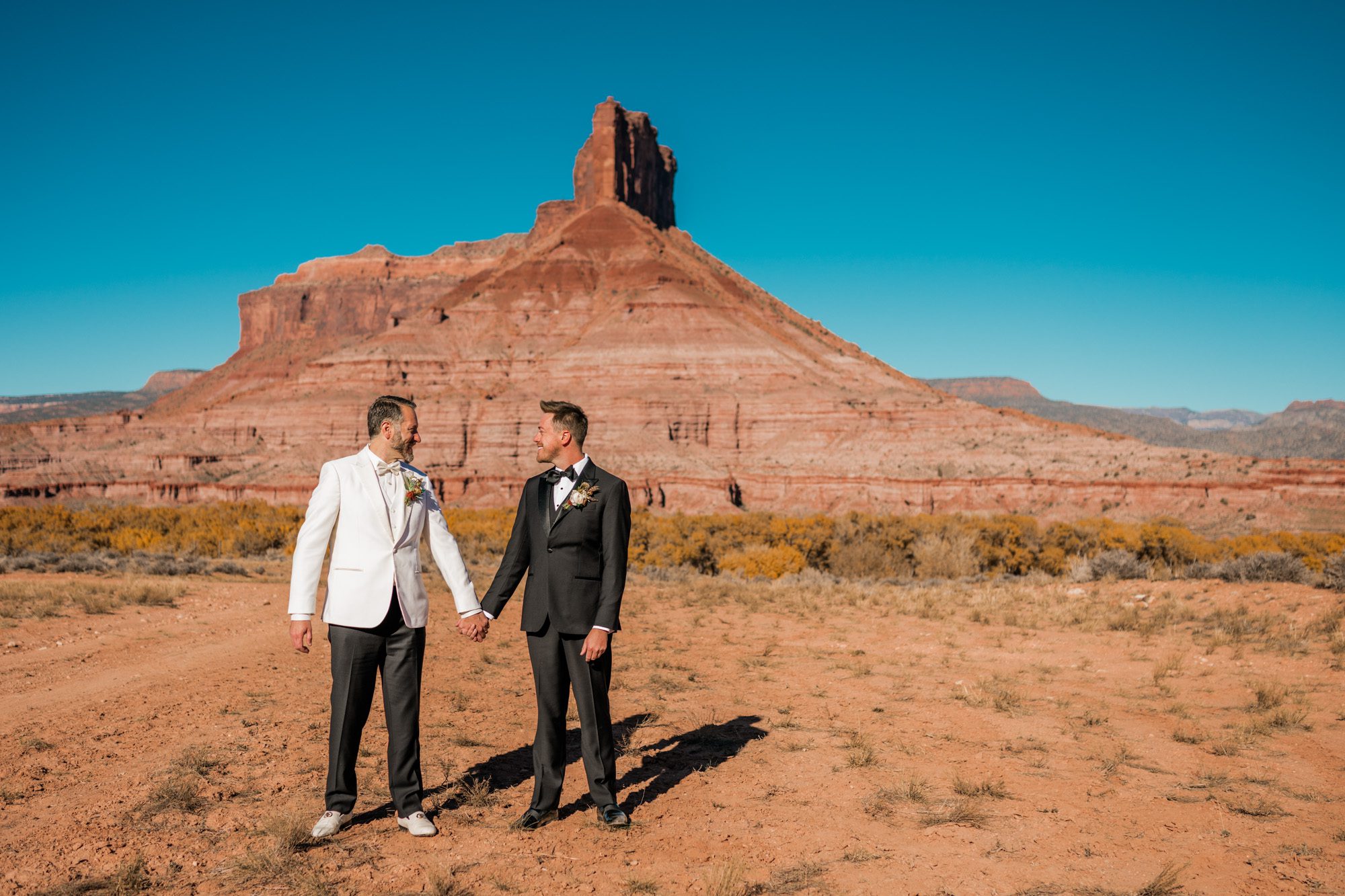 When John and James began planning their fall wedding at Gateway Canyons Resort, they knew they wanted something that perfectly balanced natural beauty with unexpected celebration—and that’s exactly what they created. Their November wedding day was filled with golden desert light, heartfelt moments, and one of the most memorable reception surprises I’ve ever witnessed.