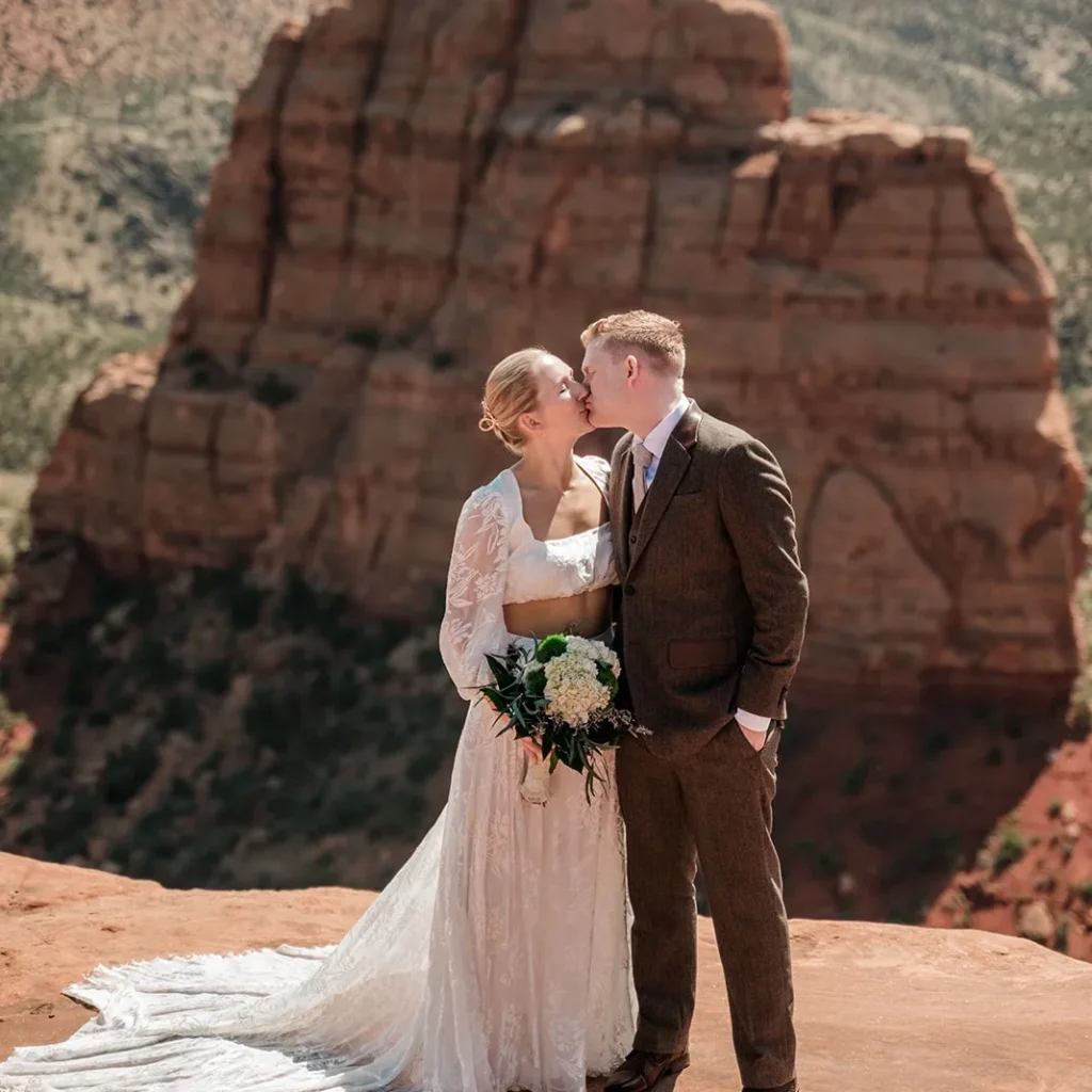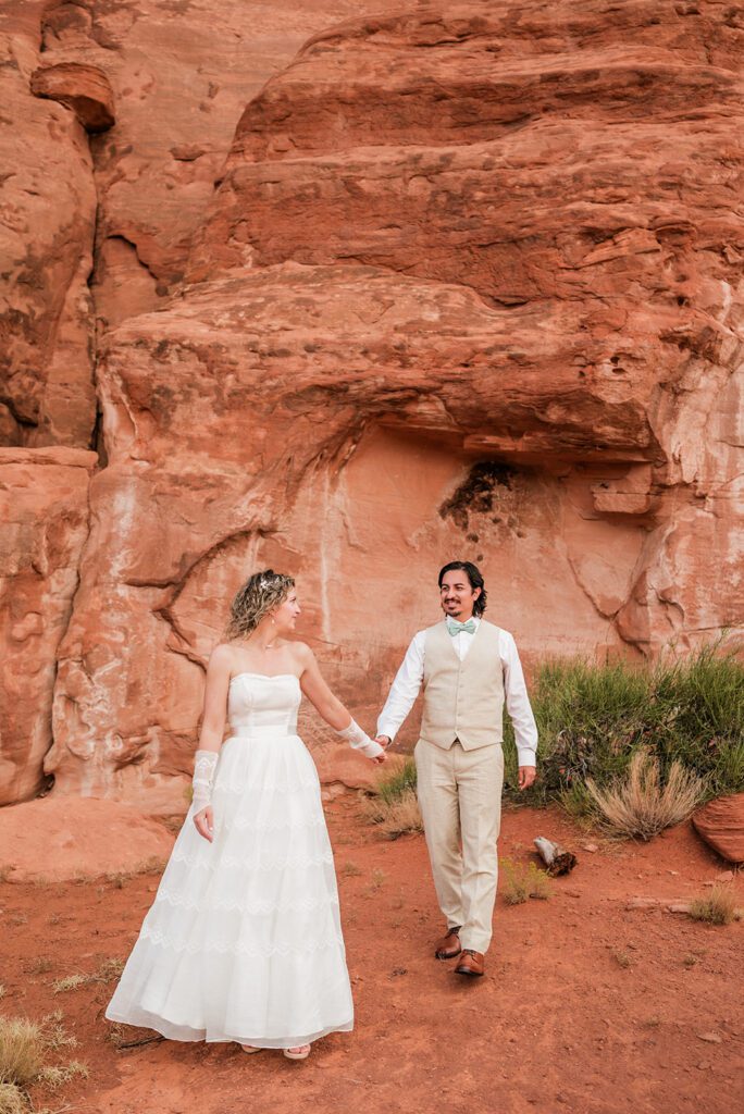 Practical consideration: If you’re hiking to your ceremony spot or scrambling over rocks in Moab, a shorter dress is genuinely more functional. I’ve watched couples navigate trails in floor-length gowns, and while it’s doable, it’s not always fun.